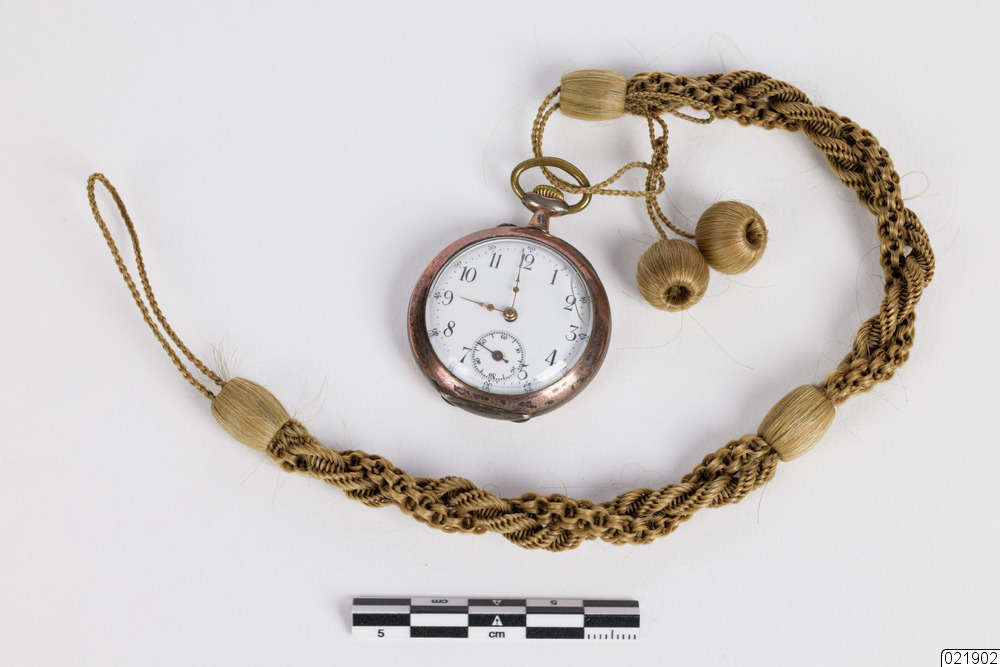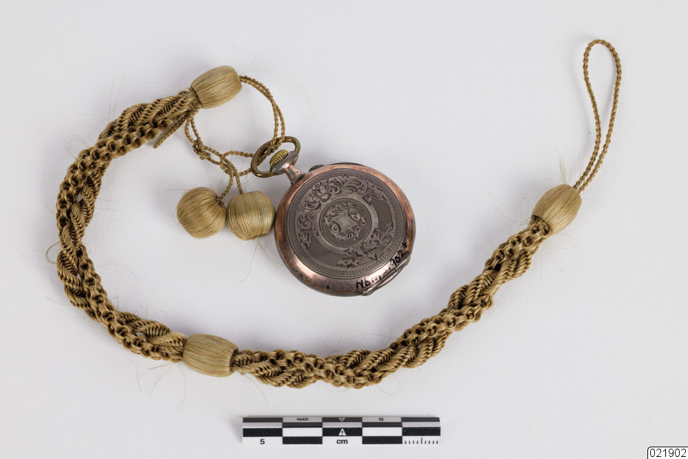 Fickur med klockkedja av hår. Uret har cylinderurverk och boette av metall. Det har bygel och skruvknapp. Baksidan har gravyr i form av en sköld omgiven av bladrankor. Den vitemaljerade urtavlan med arabiska siffror har tim- och minutvisare, samt särskild sekundurtavla. Uret är märkt på insidan av ytterboetten: "A 0,800 J", "6 9526" samt har inristade otydliga bostäver och siffror. Märkning på inn...