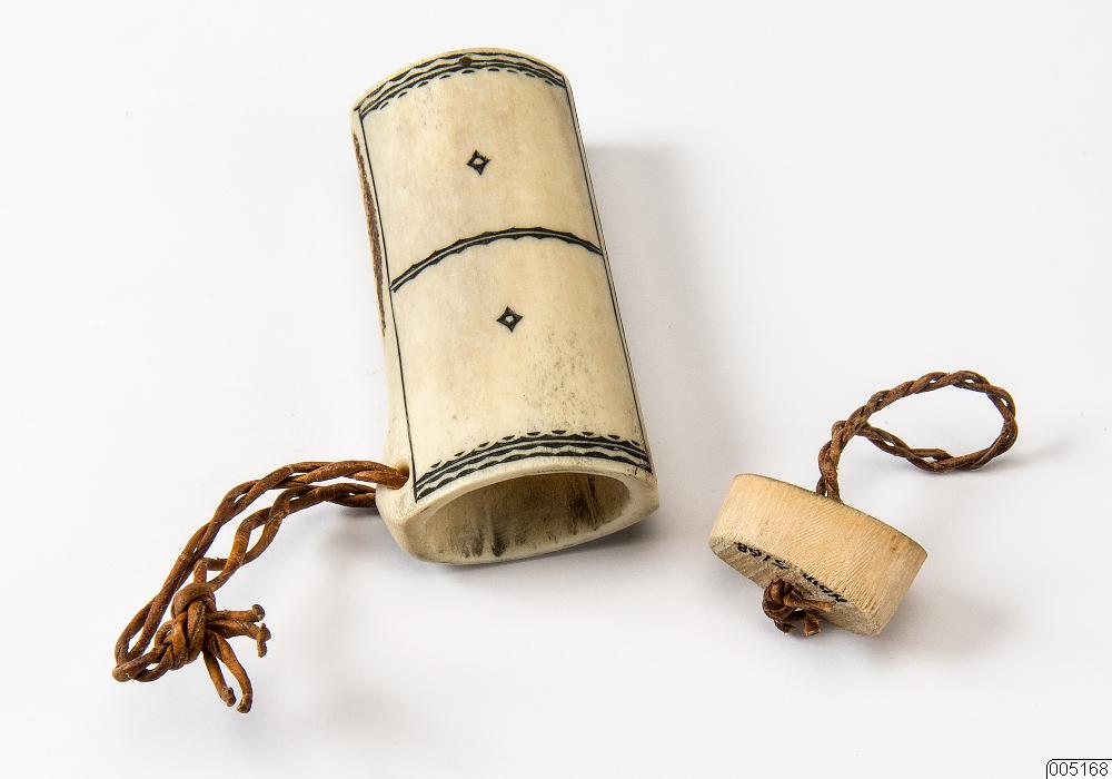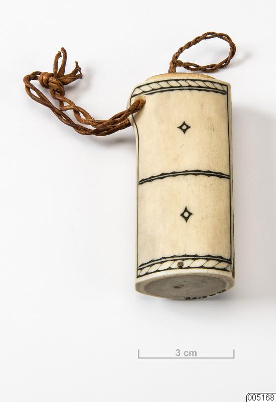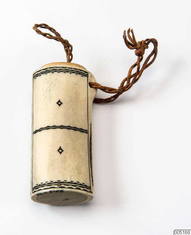 • Tändsticksask. Samisk tändsticksask av horn, ornamenterad med bandfläta och trianglar.