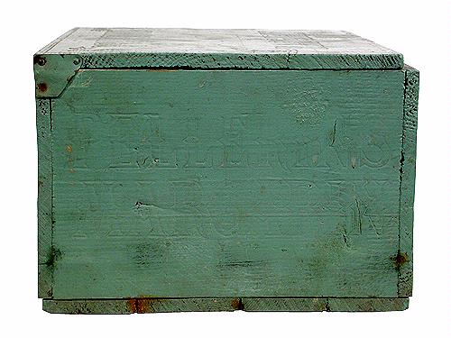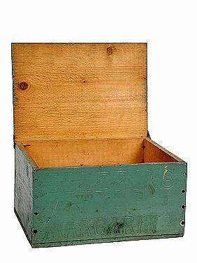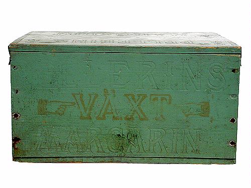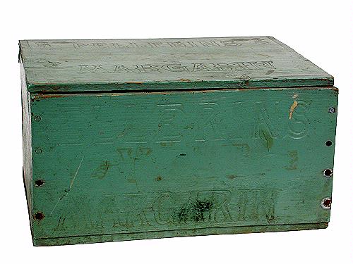 Margarinlåda, bestående av en fyrkantig enkelt kant-mot-kant ihopspikad trälåda med fyra spikar i varje sidokant. Botten är spikad med en spik efter långsidan och tre efter kortsidan. Locket är platt utan kant och fäst vid underdelen med två trekantsgångjärn. Det ena märkt med med svart ofullständig text: "SENGREN". Trälådan är grönmålad med undantag av botten och insidan. Alla sidorna är präglade...