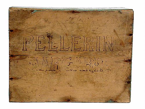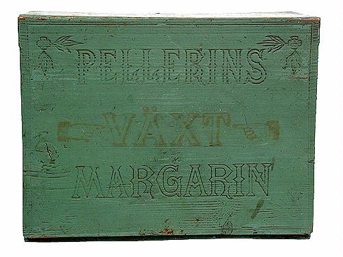Margarinlåda, bestående av en fyrkantig enkelt kant-mot-kant ihopspikad trälåda med fyra spikar i varje sidokant. Botten är spikad med en spik efter långsidan och tre efter kortsidan. Locket är platt utan kant och fäst vid underdelen med två trekantsgångjärn. Det ena märkt med med svart ofullständig text: "SENGREN". Trälådan är grönmålad med undantag av botten och insidan. Alla sidorna är präglade: "PELLERINS MARGARIN", på locket, framsidan och baksidan har med svagare tryck lagts till: "VÄXT" och två pekande händer mellan PELLERINS och MARGARIN