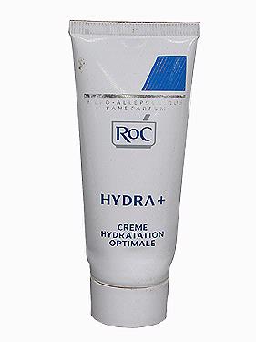 På framsidan av tuben står med blå text: "ROC" i en silverram och "HYDRA+" samt med mindre text "CREME HYDRATATION OPTIMALE". Högst upp finns en blå fyrkant med vänstra lodkanten lutande inåt. Fyrkanten är randad med vita streck i linje med den lutande kanten.