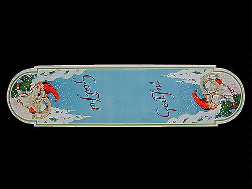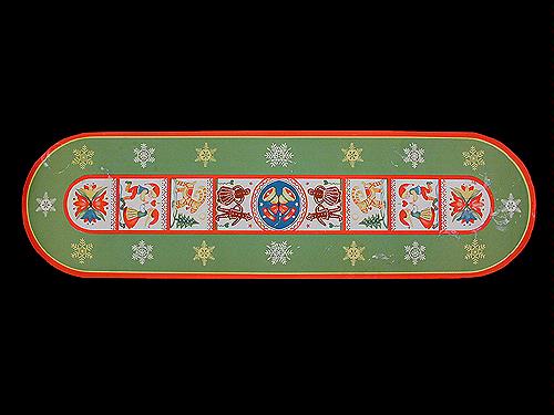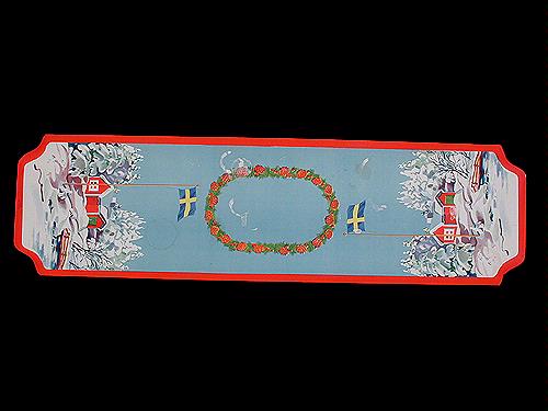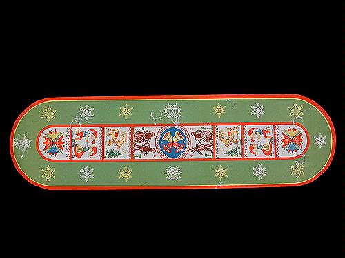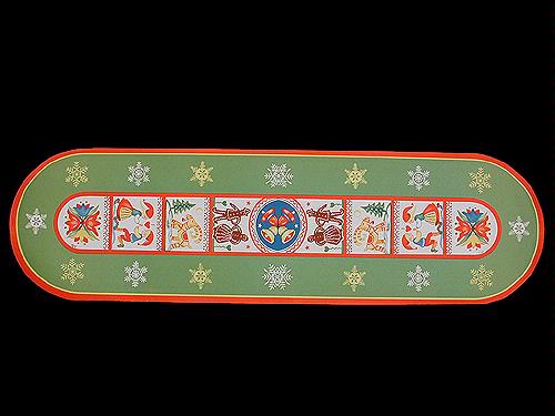 Det finns en duk (L 99,5 cm, B 23,0 cm) som är vit och där vitskäggiga tomtar dansar ringdans över hela duken. Tomtarna är klädda i röda luvar, röda jackor, gula knäbyxor, röda strumpor och gula tofflar. I dukens kanter skymtar fram julgranar försedda med levande ljus och hängande äpplen.