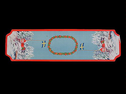 Det finns tre dukar (L 87,5 cm, B 24,5 cm) där motivet är en röd stuga med vita knutar, kryssfönster på gaveln och en förstuga med diagonalt grönrandig ytterdörr på långsidan. Stugan omges av snötyngda granar och stora snödrivor. I förgrunden finns en liten träbro över en bäck. Framför stugan finns en flaggstång där den svenska flaggan är hissad. (juldagen är flaggdag) Bakgrunden är himmelsblå. Motivet upprepas vid dukens kortändar med flaggstängerna riktade mot mitten. I mitten på duken finns en långsmal oval i dukens längdriktning, bestående av granris och kottar.