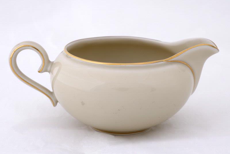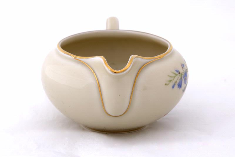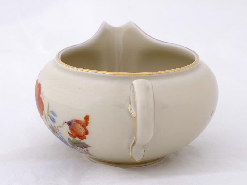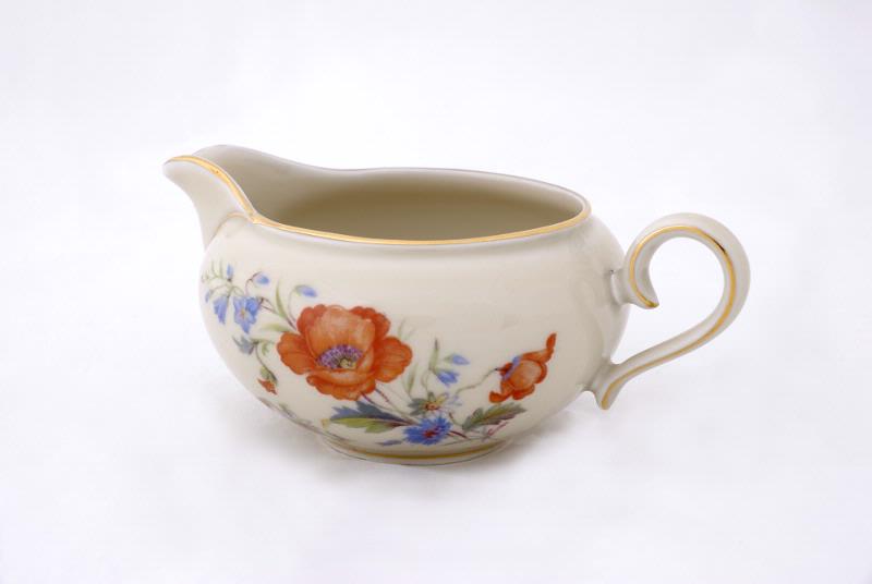 Gräddsnipa. Rundväggig snipa med hällränna och grepe. Stor och liten blomgrupp på ena sidan bestående av blåklockor, blåklint, prästkrage, vallmo och blad i muffelfärg (på glasyr). Guldkanter.