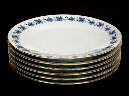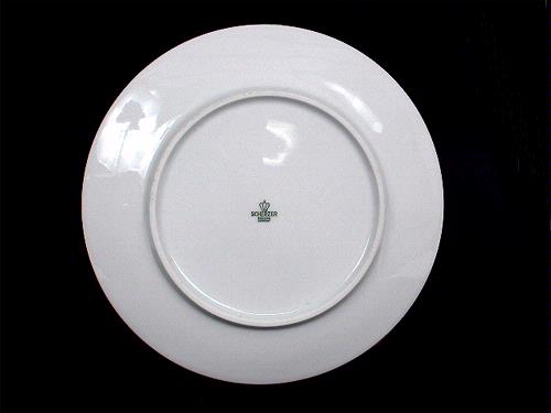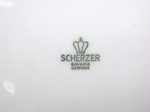 • Assiett, rund, vit porslinstallrik med blå obruten bård av lönnlöv. Ytterkanten är guldfärgad. Undersidan märkt i grönt: "SCHERZER BAVARIA GERMANY" krönt med en korskrona.