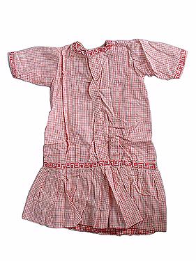 Klänningen är rutmönstrad av smala röda linjer på vit botten. Den är knäkort och överdelen knäpps på framsidan med fem tryckknappar. Halslinningen (Diam 9,2 cm) är rundad. Hela klänningen är rynkad. Kjoldelen vidgar sej utåt.