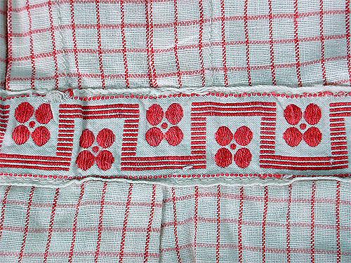 Halslinning, ärmändar och midjeband är randigt kreneleringsmönstrade i rött. I mellanrummen i kreneleringen finns en figur bestående av fyra röda rundlar med en mindre i mitten. Klänningen är försedd med en hank i nacken.