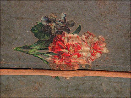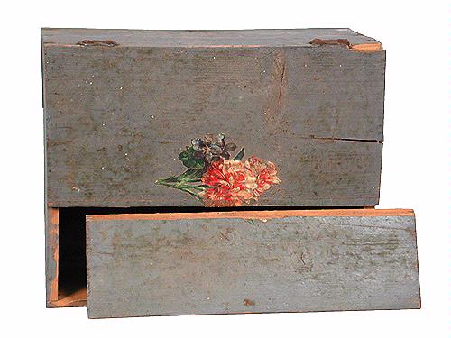 Margarinlåda, bestående av en fyrkantig enkel kant-mot-kant ihopspikad trälåda med tre spikar i varje sidokant. Botten är spikad med en spik efter långsidan och tre efter kortsidan. Locket är platt utan kant och fäst vid underdelen med två gångjärn av läder på långsidan. Trälådan är blågråmålad med undantag av botten och insidan. På locket finns en utklippt bild av en flerfärgad blombukett, ...