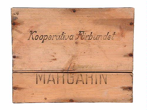 Margarinlåda, bestående av en fyrkantig enkel kant-mot-kant ihopspikad trälåda med tre spikar i varje sidokant. Botten är spikad med en spik efter långsidan och tre efter kortsidan. Locket är platt utan kant och fäst vid underdelen med två gångjärn av läder på långsidan. Trälådan är blågråmålad med undantag av botten och insidan. På locket finns en utklippt bild av en flerfärgad blombukett, fastklistrad. På insidan av locket står det skrivet för hand: "Margit Olsson Margit O". På långsidorna och gavlarna står det tryckt under målningen: "Kooperativa Förbundet" med svart text och "EVE" med röd text samt "MARGARIN" med svart text. På botten står det tryckt: "Kooperativa Förbundet MARGARIN" med svart text.