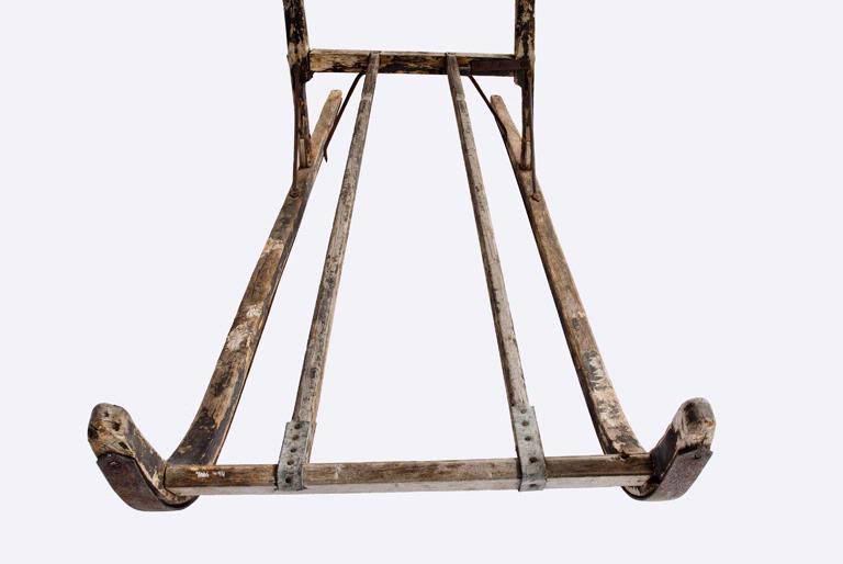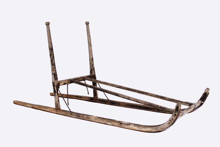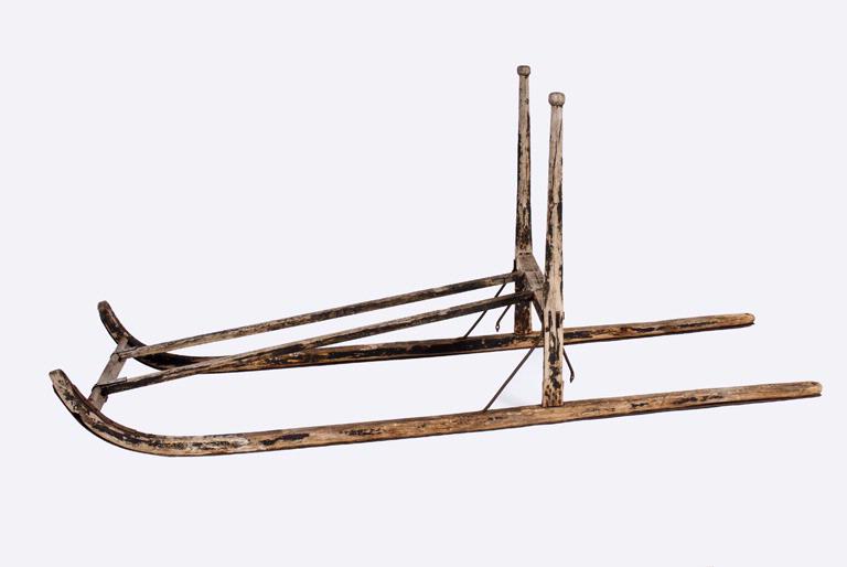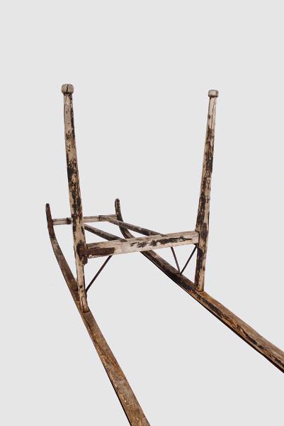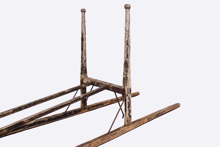 • Sparkstötting av furu med intappade och narade ståndare utan tvärslå mellan. Järnskodda medar. Svartmålad.