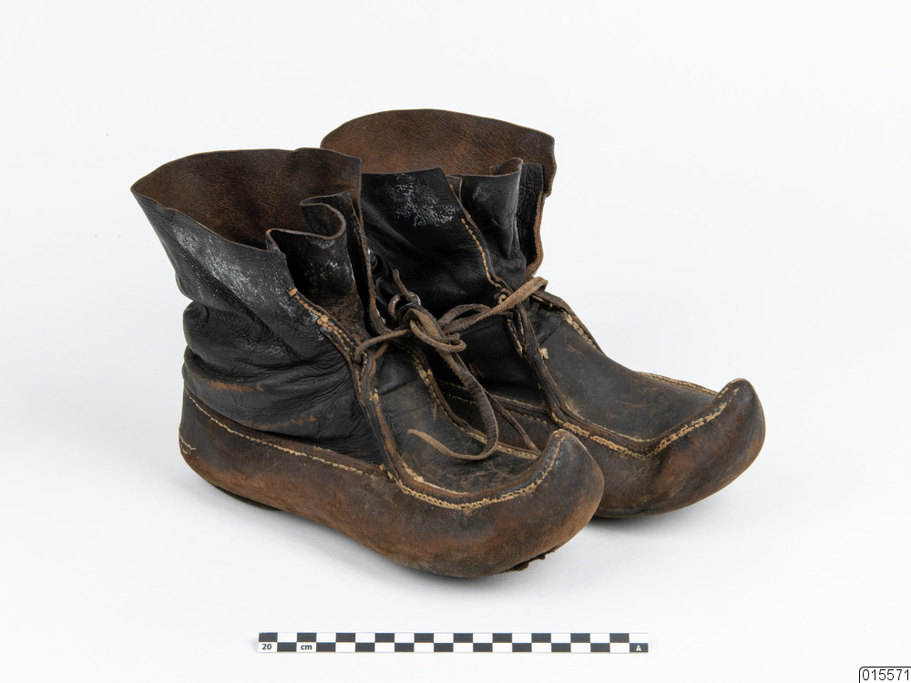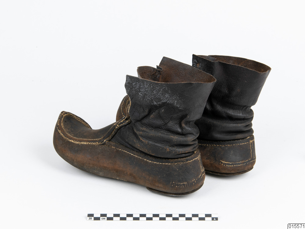 Näbbsko. Ett par bruna näbbskor med läderrem. Pliggad klack. Antal delar: 2 st. Tidigare angiven teknik: handsydda, laskade, pliggade.