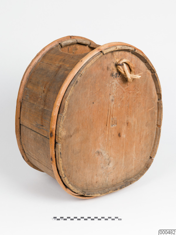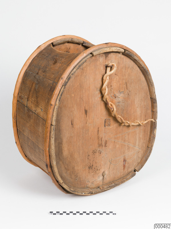 • Mjölkflaska av furu. Äggformad med laggar och vidjehandtag. Omålad. Inskuret och inbränt på flera ställen: "NB".