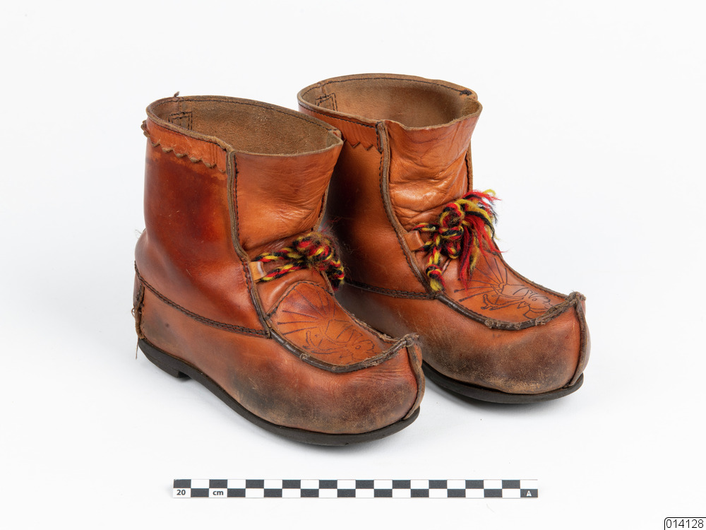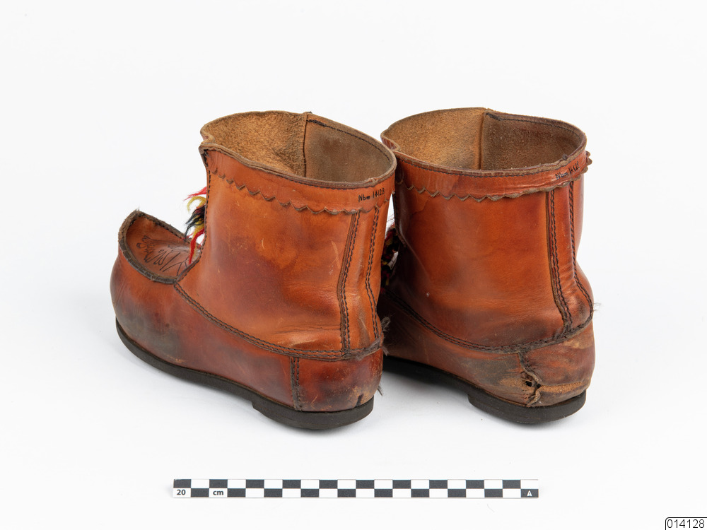 Näbbsko. Barnnäbb med kort skaft. Sågtandad läderremsa kring skaft. På tåhätta inbränd ren vid solnedgång. Två öglor i främre kantsömmarna för fäste av knytband. Stickningar i mörkbrunt med funktion som dekoration. Räfflad gummisula. Antal delar: 2 st. Tidigare angivet material: garvat skinn, ylleband, gummisula.