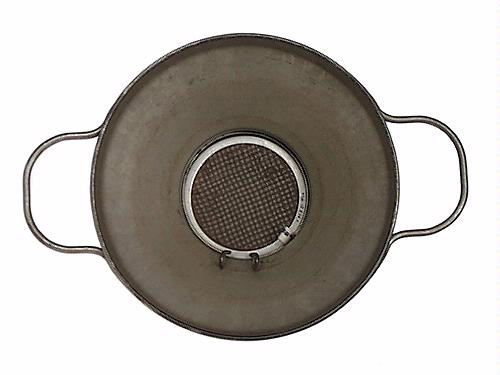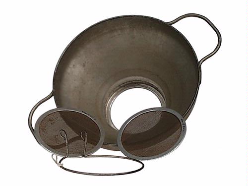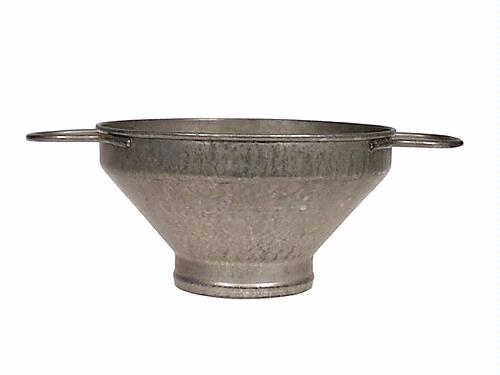Mjölksil. a) Skålformad sil, L 29,1 cm, H 11,1 cm, Diam 20,1 cm, med ett i botten stort hål på vilket silduken vilar. Text: "MVA". b) och c) Plåtram med silduk, Diam 9,1 cm, av flätad järntråd. d) Silduksklämma. Ring, Diam 9,8 cm, av järntråd, med vardera änden upphöjd till ögla. Antal delar 4 st.
