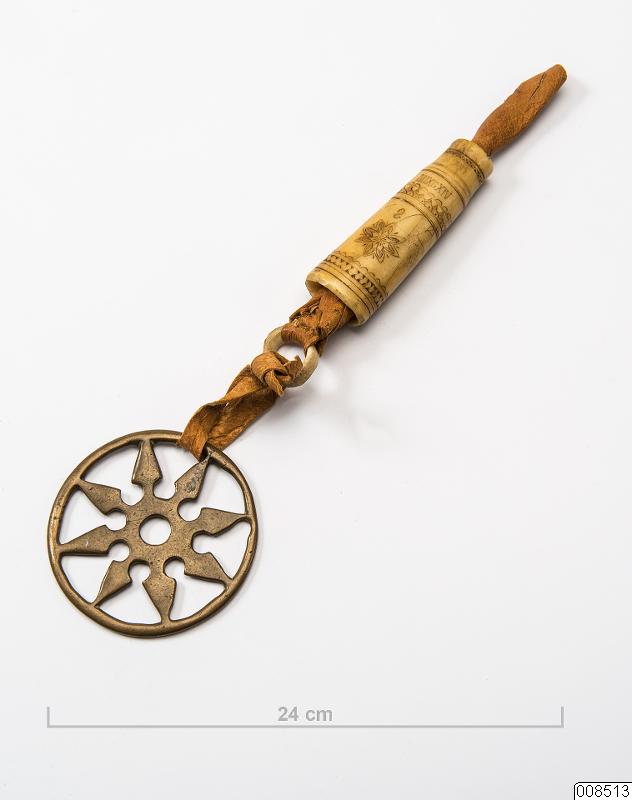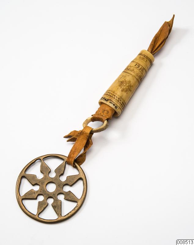 • Gehäng av horn med banddekor och blomma. Ring av mässing. Märkt: 1910 och MIXCX.