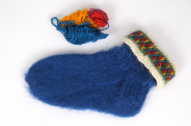 • Socka av lovikkagarn i blått och vitt, annat ullgarn: grönt, rött och turkos. Stickade på 4 stickor, sydd dekoration på skaftet (kråkspark).