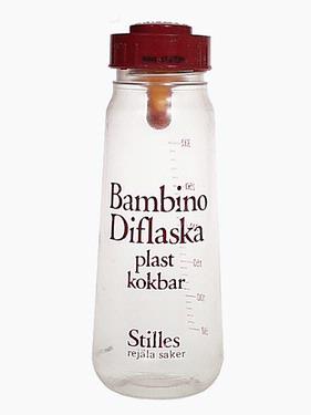 Diflaska i fyra delar. Behållaren består av en cylindrisk flaska, något avsmalnande uppåt, av genomskinlig plast. Flaskan är garderad från 50 till 300 cl och har text "Bambino Diflaska, plast kokbar" med mera. Vid den övre änden är flaskan gängad. Där fästs dinappen, tillverkad av gulbrun genomskinlig gummi. Dinappen fästs fast med hjälp av en vinröd plastring som är gängad på insidan. Till diflas...