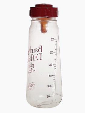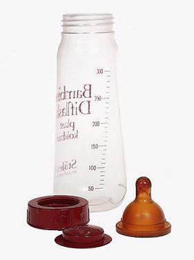 Diflaska i fyra delar. Behållaren består av en cylindrisk flaska, något avsmalnande uppåt, av genomskinlig plast. Flaskan är garderad från 50 till 300 cl och har text "Bambino Diflaska, plast kokbar" med mera. Vid den övre änden är flaskan gängad. Där fästs dinappen, tillverkad av gulbrun genomskinlig gummi. Dinappen fästs fast med hjälp av en vinröd plastring som är gängad på insidan. Till diflaskan hör även en plastplatta som fungerar som lock då flaskan ej används. Antal delar: 4 st.
