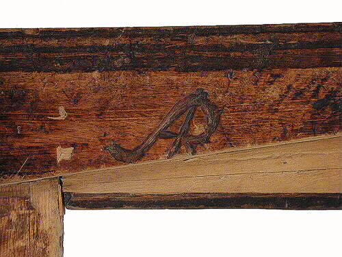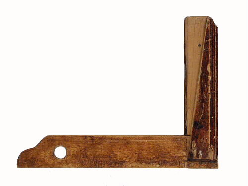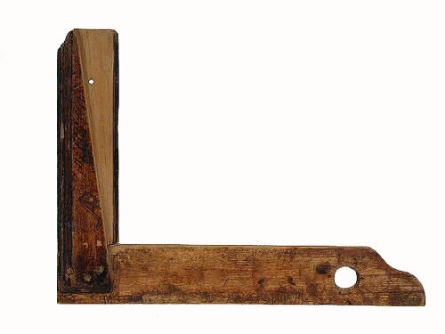 • Vinkellinjal av furu. Delarna fästade vid varandra med trätappar. Brunbetsad. Inskuret: "AR".