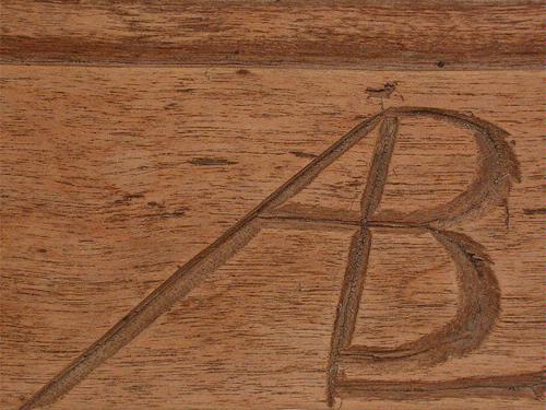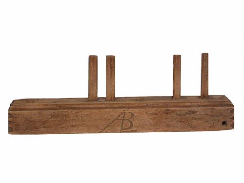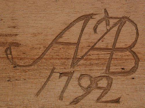 Solvstock. Solvträ med 5 pinnar. Under träet ristat AAB med 1792 rakt under (det sista A och B har en gemensam stapel och A har ett kryss till vänster om toppen), samt ALB (bokstäverna sitter ihop med en gemensam stapel).