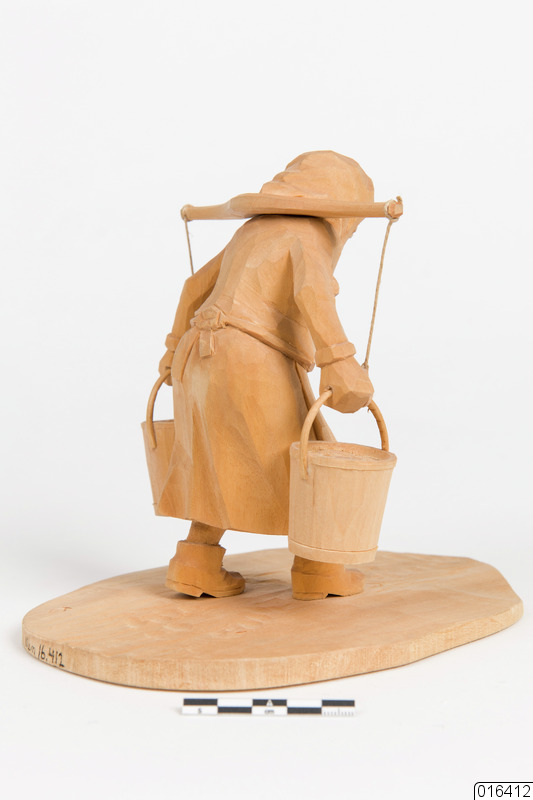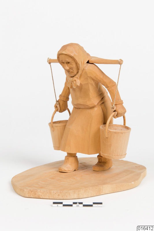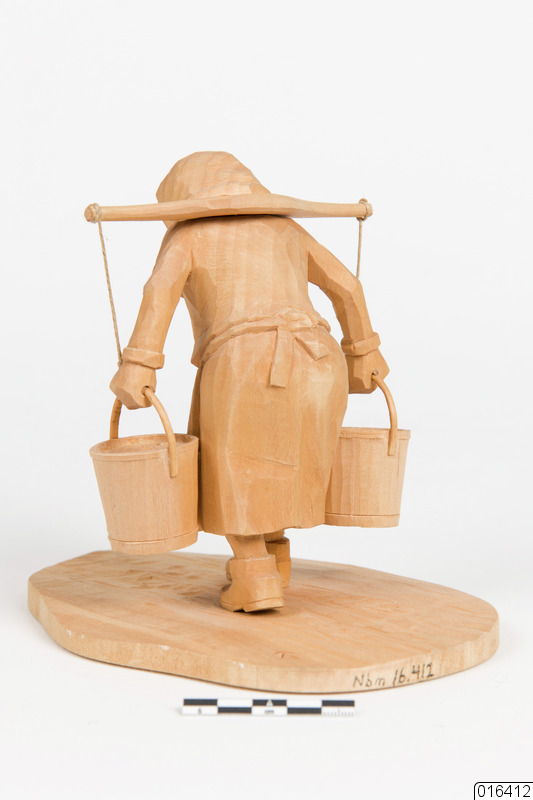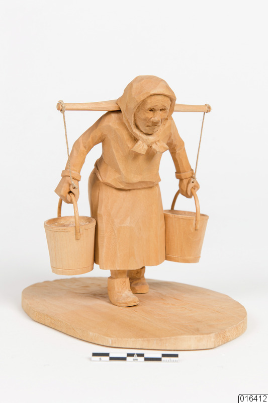Skulpturen föreställer en äldre kvinna i kjol, tröja, huvudduk och kängor, bärandes två vattenhinkar med hjälp av ett ok över axlarna. Från okets båda ändar löper ett linsnöre ner till en krok av trä som ligger runt hinkens handtag. På sockelns översida är ristat "K7". På undersidan är inbränt "Kjell Gustafsson 1979 / under oket". Träskulpturen är fastskruvad på en oval sockel av trä.