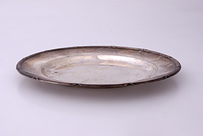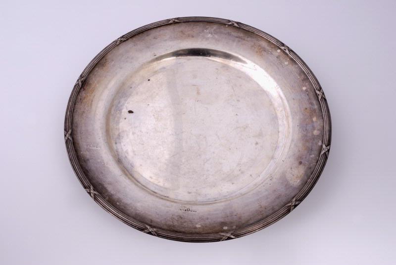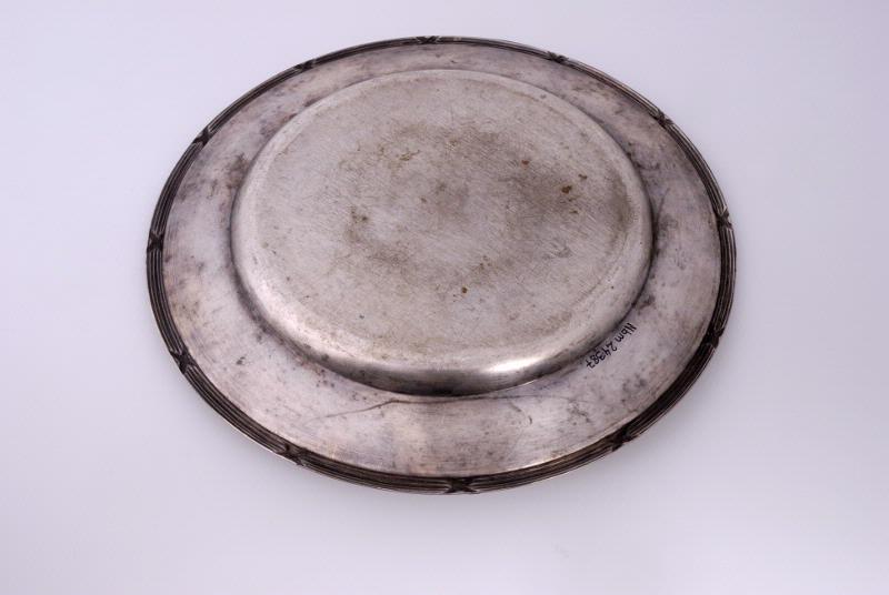 Runt silverfärgat fat med utvikt brätte och dekorbård. Dekorbården består av fyra åsar på jämna mellanrum försedda med bandkryss (12 st). På brättet är stämplat: "G.A.B" (GuldsmedsAktieBolaget) en Vasakärve och." ALP "NS".