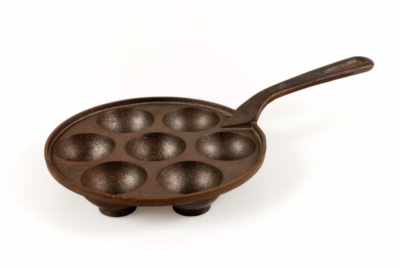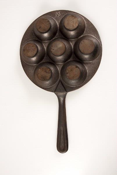 • Tjock gjutjärnspanna med sju halvklotformade hål (Diam 6 cm, Dj 3 cm) placerade på en platt rund järnskiva. Hålen är på undersidan försedda med små runda (Diam 3,5 cm) värmeledande plattor. Intill skaftfästet finns en trekantig förhöjd snibb på vilken det är instämplat: "No 1". På motstående sidan står det: "NQ" stämplade på varandra. Ovansidan är försedd med en kant (H 0,5 cm). Skaftet har en dr... Visa hela
