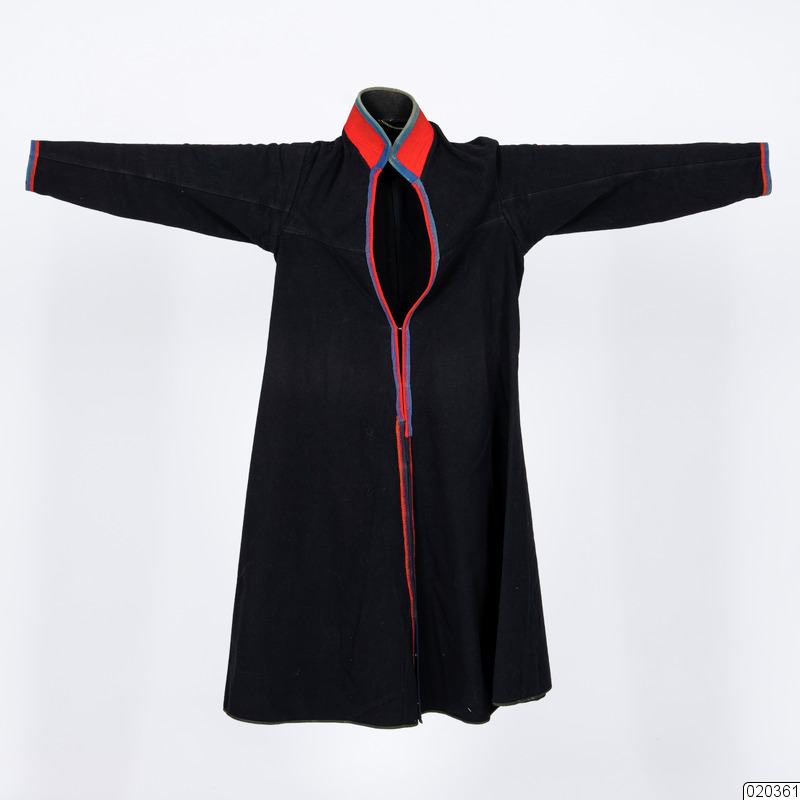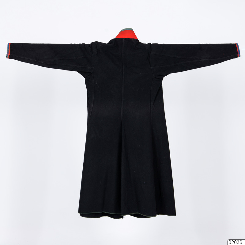 Herrkolt, av ett svart ylletyg, med ståkrage som är beklädd med ett rött ylletyg och kantad med ett blått, samt helöppen knappslå som stängs med 9 hyskor och hakar. Framstyckets- och ärmöppningarna kantas med ett rött och blått tyg fastsydd med röda och gröna kråkstygn. Framstycket har besparing och bakstycket är sydd av två stycken. Ärmarna har isydd kil. På koltens insida vid bakstycket finns en...