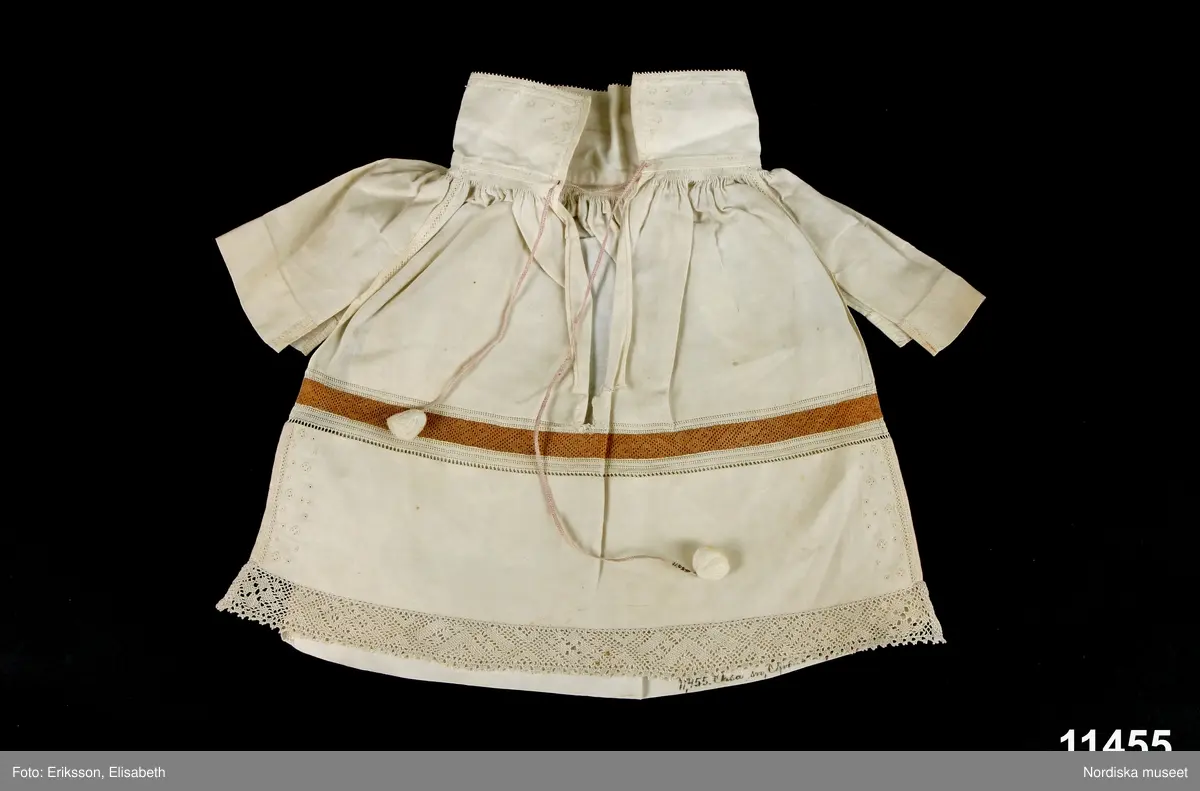 "Nytt; af lhvitt linne, med nedvikt något broderad krage, framtill ett mellanbroderi i gult med hålsöm å ömse sidor. Nedtill på sidorna broderade och i kanten en knypplad spets. Med snöre i rödt och hvitt med hvita tofsar. Söndrigt."