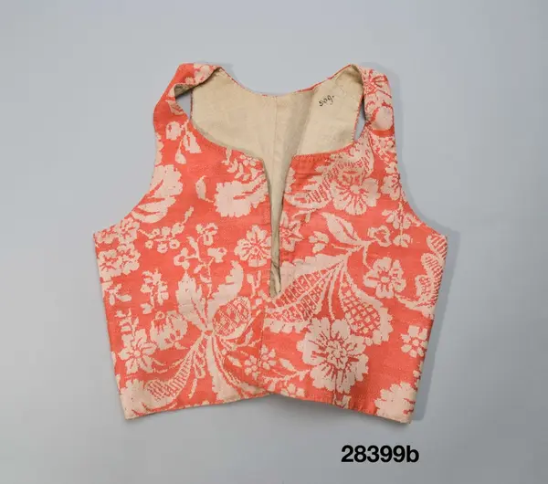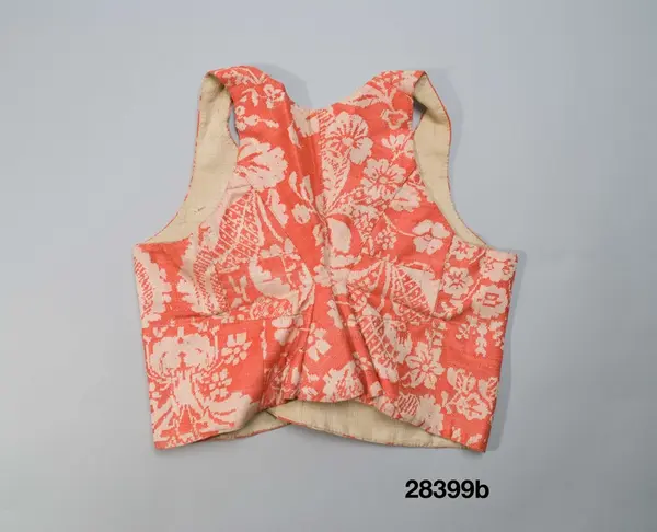 b. Livstycke längd: 42 cm skörtlängd:12 cm. Av fint kamgarnsylle i damast med storblommigt vitt mönster på röd botten med pressad och glättad yta. ( samma tyg som i 28 475 och 222 437, alla fr. Alfta)