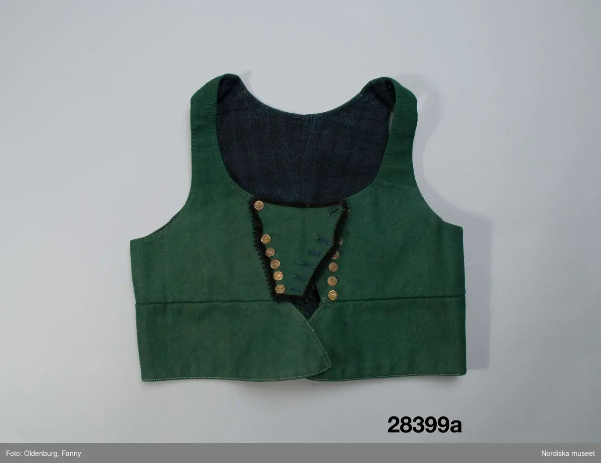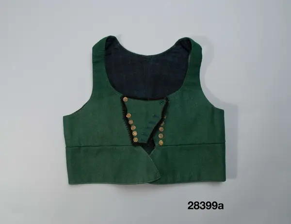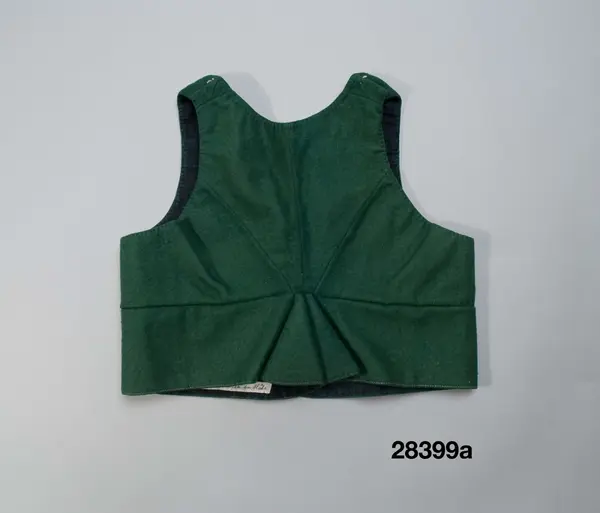 Av grön kraftig vadmal, 2 framstycken/sidstycken, och 2 smala ryggstycken. En intagen söm löper runtom i den förhöjda midjelinjen, från denna linje börjar ryggskörtet och på framstyckena den utsvängda skörtfliken. Denna nedre del är runtom kanten stickad med gulgrönt lingarn. Knapparna är fästade genom tyget med en sämskskinnsremsa som löper på insidan. Fodret är en ripsväv med blå linvarp och inslag av samma garn samt svart entrådigt ullgarn.