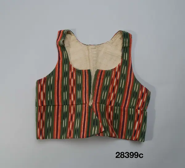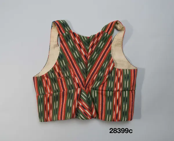 Av hemvävt halvylle i korskypert med mörkblå linvarp och täckande inslag av entrådigt ullgarn randigt i grönt och rött med smala ränder i dessa fält i mörkblått och vitt, de flesta flamfärade i blått och vitt så att mönstret blir strimmigt. 2 framstycken/sidstycken med en skarvbit under var arm, 2 smala ryggstycken avslutade i ett skört med veck som styvats och fästs ihop med några stygn. En intagen söm runtom markerar den förhöjda midjelinjen och från denna börjar skörtvecket. och fram de utsvängda skörtflikarna på framstyckena. Knäppning med 5 par grova hakar och hyskor av mässing.