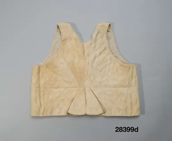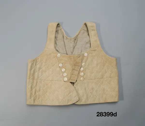 d. "Livstycke av sämskat skinn med stickningar över hela livet. " Längd 40 cm, skört 10;5 cm. Ljust sämskskinn med rutstickning, en rak stickrad markerar den höga midjelinjen. 2 framstycken/sidstycken med utsvängda framkanter och 2 smala ryggstycken avslutade i ett skört med hög ryggskärning. Skörtvecket hoplagt och fäst med några stygn. Axelband med endast längsgående stickning. Rutstickad tekantig bröstlapp fastsydd på höger framstycke med knäppning mot vänster med tränsade knapphål och 5 runda platta benknappar, motsvarande knapprad även på den fastsydda sidan. Innanför bröstlappen knäppning med 4 hakar och hyskor av mässing. Foder av ljus linnekypert.