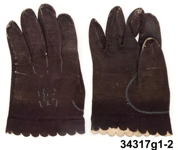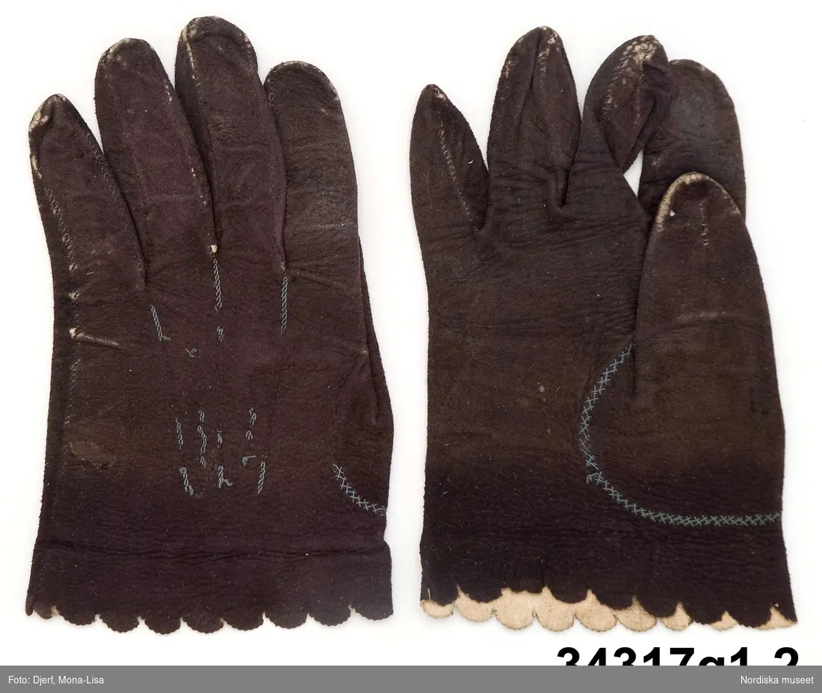 d. Kjolväska, längd 23,5 cm, bredd 19 cm, ficka i skarvsöm av små rombiska vadmalsbitar i svart, gult, rött, violett och vitt, den nedersta biten i mitten markerad med en grön och vit tygremsa i sömmen. Överkant av blå vadmal med ett knapphål tränsat med ljusblått lingarn, bakstyckets överdel, som syns ovanför fickan, av blå, gula och bruna vadmalsbitar. Smidd enkel järnkrok fastsydd med grovt lingarn. Undersidan av vit linneväv i 3-skafta kypert, kantning av vitt skinn