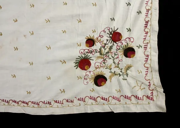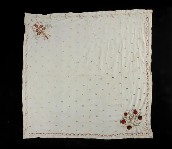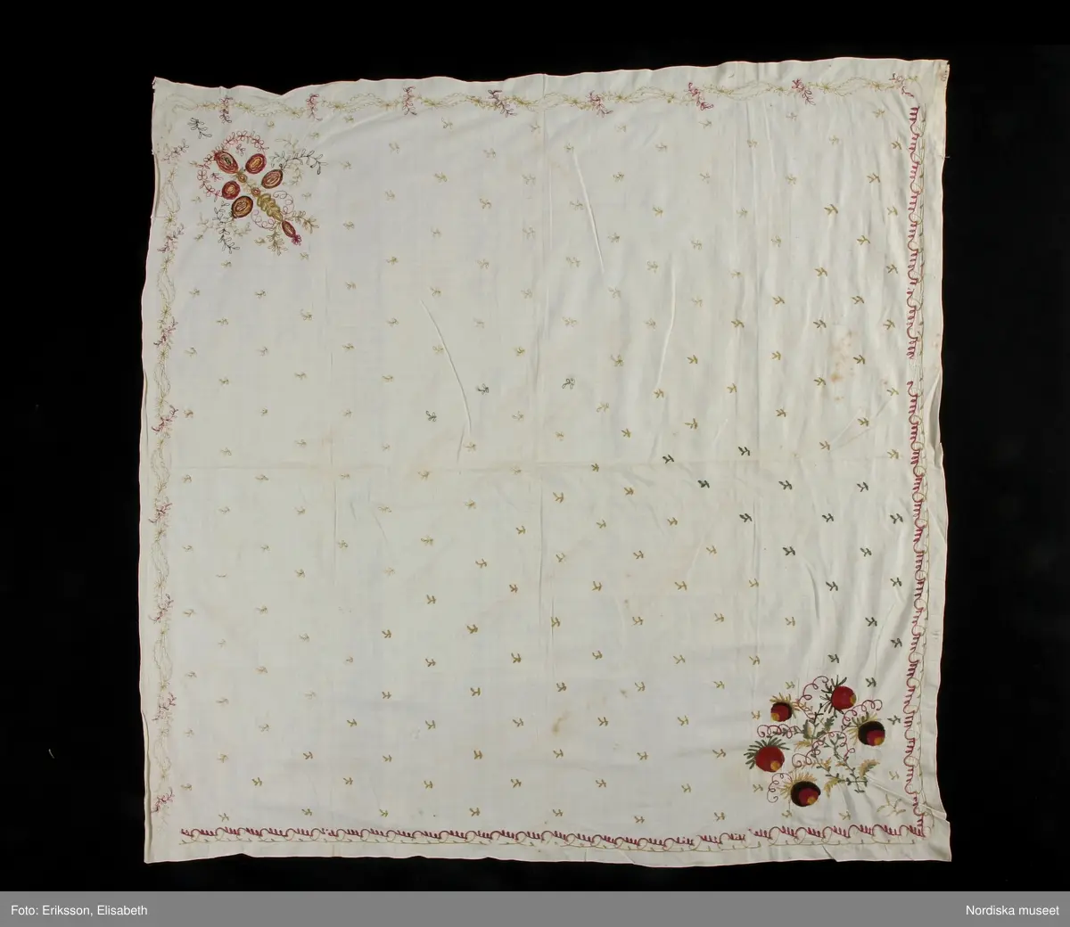 • Kvadratiskt halskläde av vit bomullslärft, broderad i tambursöm med tunt ullgarn. Broderiet skiljer sig i mönster mellan de båda diagonala halvorna och är vänt åt olika sidor så att båda blir åt rätsidan när klädet viks i trekant. Kantbård med bladslinga i gröngult och rödlila. Större hörnbroderi i de 2 motställda hörnen med fantasiblommor och slingrande blad i olika röda nyanser mörkt gult, gulgr... Visa hela