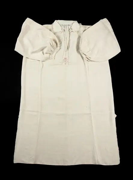 a: Skjorta. Längd: 111 cm. Längd: 50 cm - ärmlängd. Vidd: 64 cm - ärmvidd. Höjd: 10 cm - krage. Bredd: 73 cm - vådbredd.