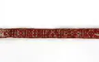 c: Mönstervävt band, 'krusband', med tofsar, 'tuppor', i ändarna. Varp av viitt bomullsgarn och rött ullgarn med grön och gul mitt- och kantbård, inslag av bomullsgarn. Bandet har varierande mönsterformer avdelade med stolpar. I ena änden har varpen delats och avslutats med två styck fyra cm långa tofsar, av tygremsor i bl a siden, den andra änden avslutas med en tofs.
