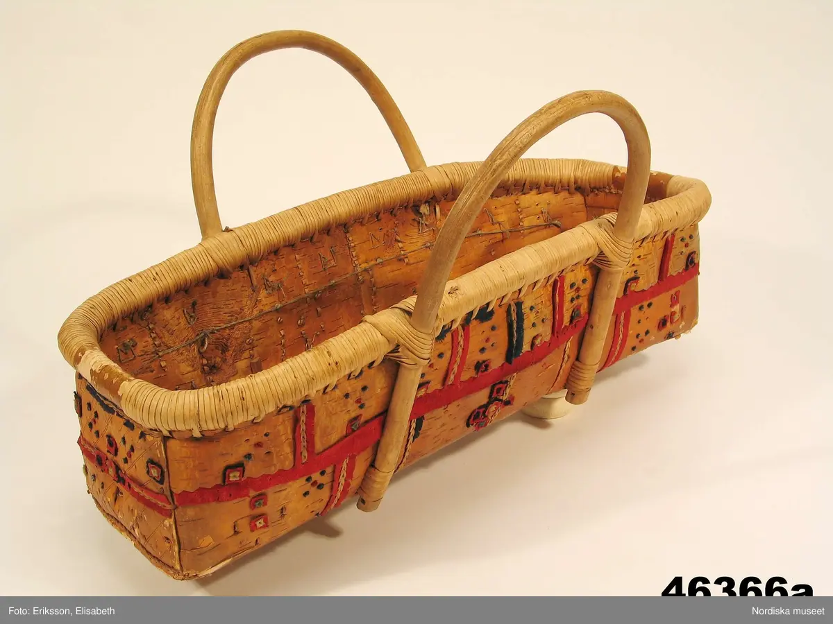 a: Dopkass av flaknäver med handtag. Kassen - korgen - har en långsmal form. Flera lager av näver har vikts och sytts ihop med klyvsöm. På kassens långsida finns en "krage" 6-7 cm bred. Kanten har en vidja lagd på ut och insidan av sidoväggen och gavlarna. Vidjan är fäst med en tät lindning av rottågor, i kanten följer en smal vadmalsremsa. Sidohandtagen består av en bågformad käpp, de är fastsurrade i ändarna och i kassens övre kant. Under klyvsömmen ligger röda och blå vadmalsremsor som förstärkning och dekoration. Kassen är dekorerad med "vadmalsnoppor"och små olikfärgade vadmalsbitar sydda på varandra. Tygbitarna är fastsydda med en lintråd som löper längs kassens insida. .Årtalet 1793 är inristat på ena gaveln.