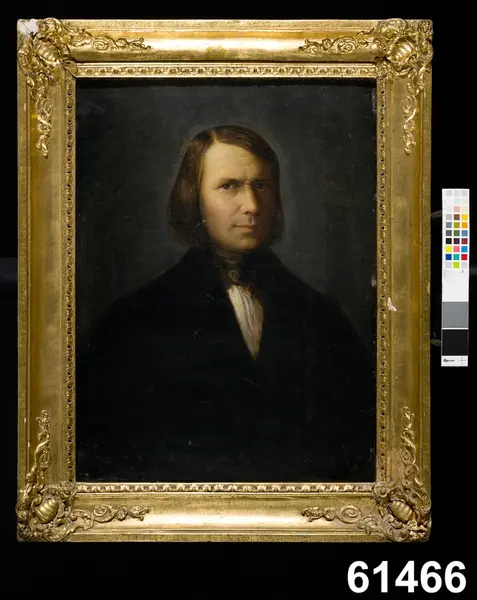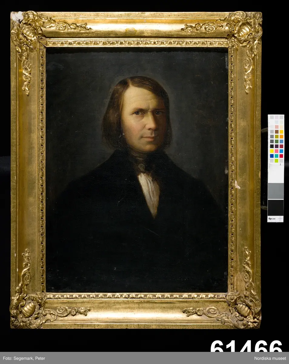 Katalogkort: "Lehman, C. P. olja på duk, förg. ram. Å spännramens baksida med blyerts: 'C. P. Lehman sjelfporträtt 1830'. Mörkbrunt hår, svart dräkt. Blågrå bakgrund. /TR 1905" Carl Peter Lehmann, född den 10 oktober 1794 i Köpenhamn, död den 3 september 1876 i Sigtuna, var en dansk-svensk målare. Han målade allt, även mytologiska ämnen och landskap. Sammanlagt skall han ha utfört omkring 4 800 porträtt. Lehmanns namn förekommer i Sverige första gången 1822, då han vid en av Götiska förbundets tävlingar vann pris för målningen Ægir och Rån ("Ägir och Ran"). Under det tidiga 1800-talet var det talrika konterfejare (porträttmålare) som, liksom Carl Peter Lehmann, reste land och rike runt och målade porträtt på beställning. Det var stor efterfrågan på privatporträtt och ämbetsmannaporträtt under 1820-, 1830- och 1840-talen.