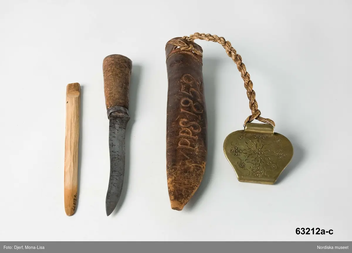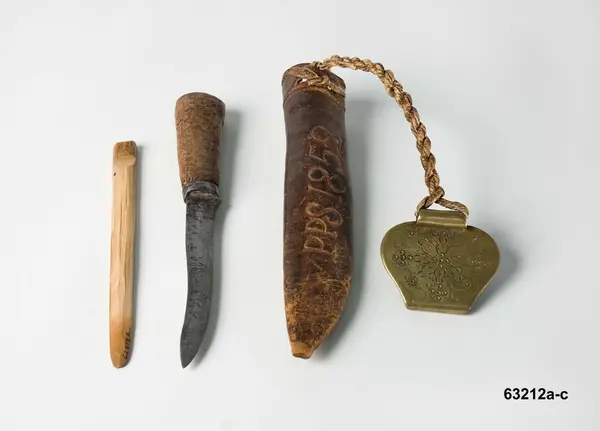 "Knifvatyg fr. Urshult sn. Från Fålaboda. Med hake av mässing. Gaffeln saknas; slidan märkt: '1852 P.P.S.', är yngre än haken och knifven. Den senare med en nu i det närmaste utplånad inskrift. Med kniven lär en ryttare blifvit ihjälstungen, hvarför knivskaftet, som fordom varit af elfenben, användts till botemedel och sedan ersatts med ett träskaft. Äfven af detta hafva spånor blifvit avskafda för nyssnämnda ändamål. Jfr: P.G. Vejde, Gårdarna i Urshult - 42 Sjöalycke, i Urshults krönika 1957. Gåva av hemmansegaren Pål Pettersson i Fålaboda, 30/9 1890."