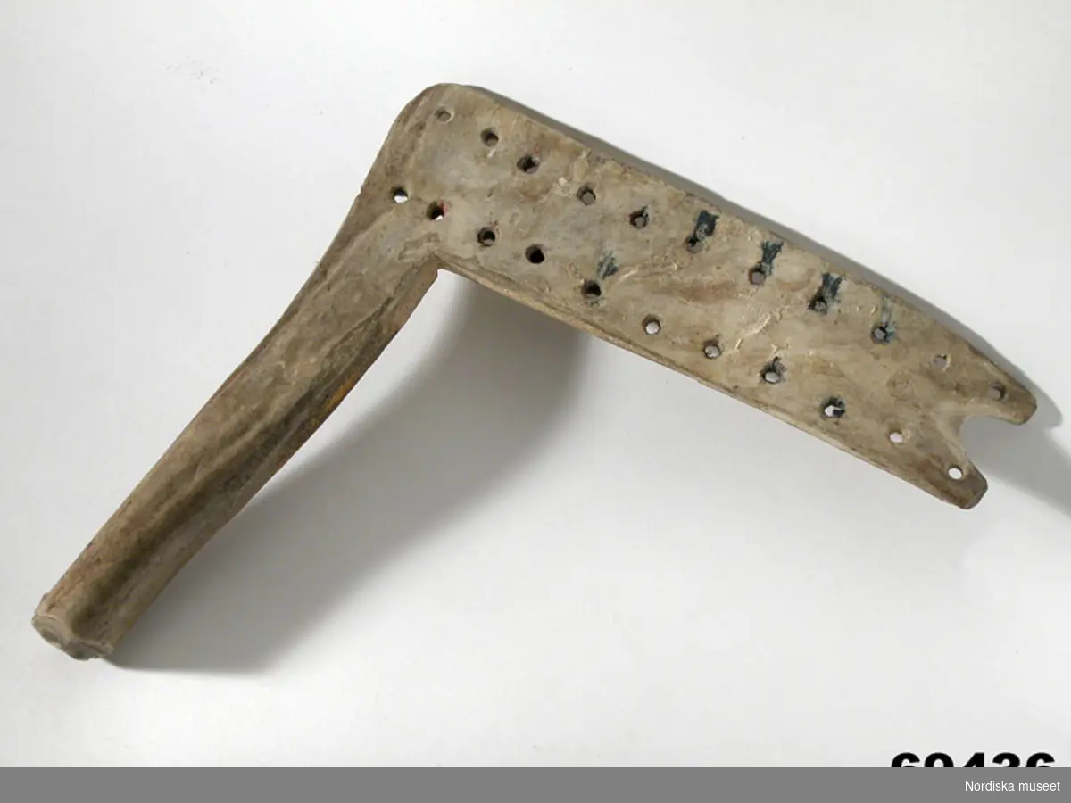 "Refsticka fr. Jukkasjärvi sn, Torne lappmark. Från Svappavaara. Af renhorn. Brukas att refva garn på till stora väfvar. Ink. af jägmästaren Hugo Samzelius. 1891. Bil. Samzelius 139."