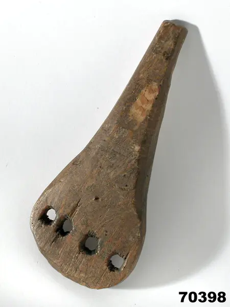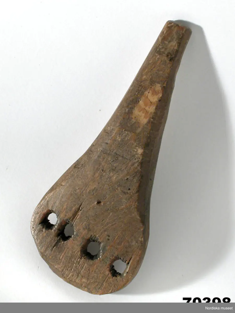 Huvudliggaren:"Refsticka fr. Gellivare sn. Lule lpmn. Fr. Moskojärvi. F[inska:] luoma-laasta. Af trä. Till refning ag vadmal. Ink. fr. Henrik Mikkelsson Runakka. Ink. af jägmästaren Hugo Samzelius. 1891. Bil. Samzelius 1.143."