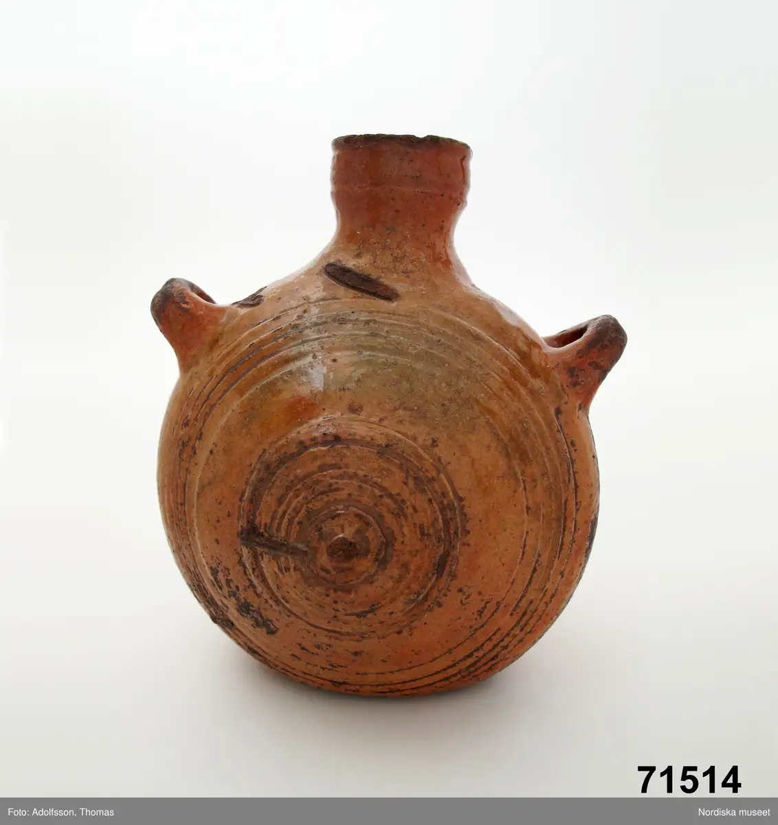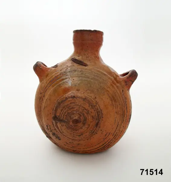 Katalogkort: "Flaska, Östergötland, Norra Vi. Bränd lera H. 18,7 cm, Tjockl. 13,2 cm Brun glasyr. Ena bredsidan plan, den andra bukig. 'Tillhört en torparsläkt på torpet Skärpet under Hubergshult.' Inköpt af herr P. A. Carlsson, Tullerum, Norra Vi, 10 kr. 3/11 1891." Utställningstext "Småting". (uppdaterad version från 2010-2011) "Fältflaska. Med en läderrem trädd genom flaskans öron och den platta sidan mot kroppen, kunde man bära med sig vatten eller brännvin. [från] Norra Vi, Östergötland."