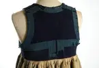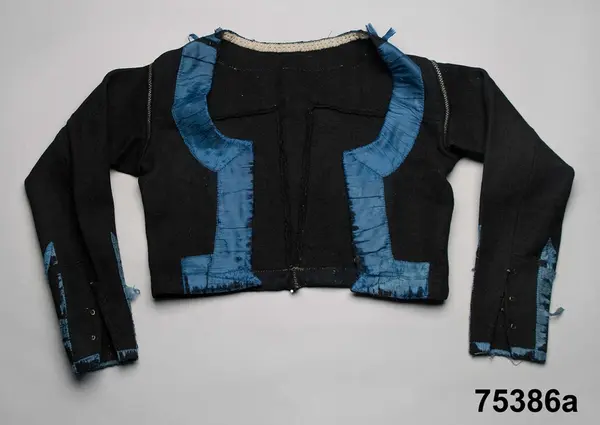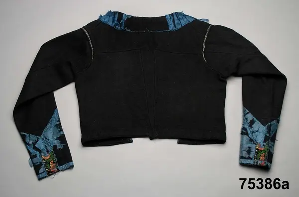 a. Tröja av svart vadmal. Mycket smal axelkarm dekorerad med en rad flätsöm med ljusblått silke. Vid halsringning, kantad runt hals och framkanter med 5,5 cm breda ljusblå sidenband. även ärmen har påsydda sidenband lagda i vinkel mot en kvadrat av blommönstrat band i rosa och grönt på svart sammetsbotten.