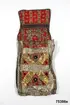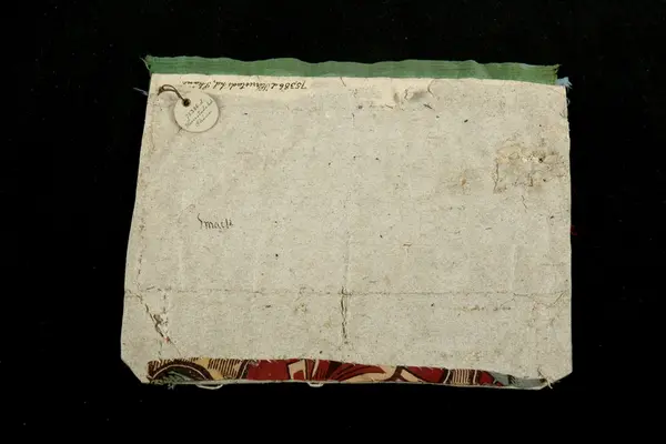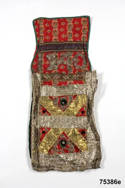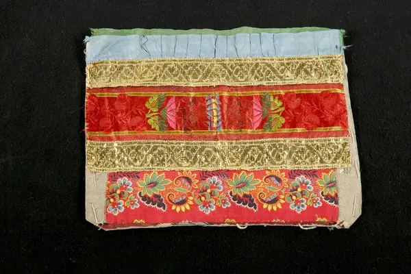 fyrkantig på stomme av grå lumppapp med påsydda rader av sidenband mm. I mitten ett brett rödmönstrat sidenband omgivet av guldgaloner, längst ned en bit rödbottnad kattun och i övekanten ett blått och ett grönt enfärgat sidenband, i nederkanten rester av ett äldre kattuntryck som verkar vara bortklippt.