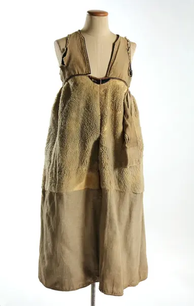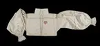 c: Överdel. Material: Textil, halvlinne. Teknik: Tuskaft. Stopphålssöm, Plattsöm. Enkel utdragssöm. Korssöm. Knyppling. Längd: 35 cm. Längd: 66 cm - ärmlängd, totallängd, inkl spets. Vidd: 61 - ärmvidd. Vidd: 96 cm - midjevidd. Höjd: 8,5 cm - krage. Färg: Vit. Rosa - märkning. Brungul - hopdragssömmar och del av stopphålssöm på båltyget.