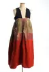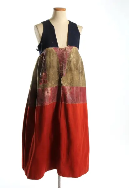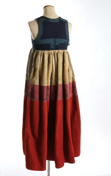 "75386 Kvinnodräkt fr. Herrestads hd. Skåne. a. Tröja af svart ylle med blåa sidenband. b. Skinnkjol med liv af blått ylle med blåa sidenband. c. Överdel med hålsöm. Märkt "K D L 1858". d. 'Smäck' af sidenband och guldband. e. List af brokigt bomullstyg med band och spetsar i guld och silver. Märkt '1840'. a. Banden sönder. Maläten b. Nött och något maläten."
