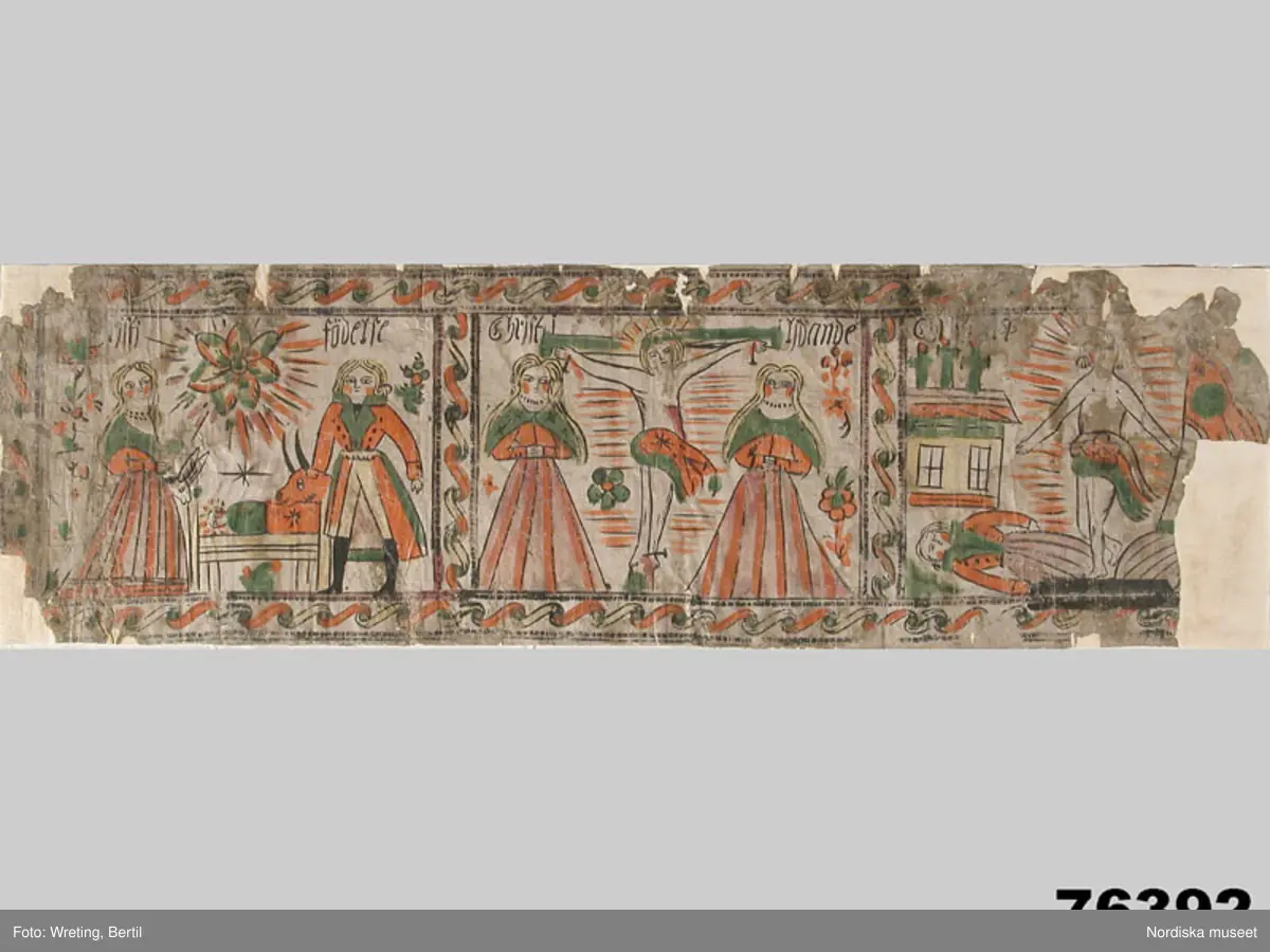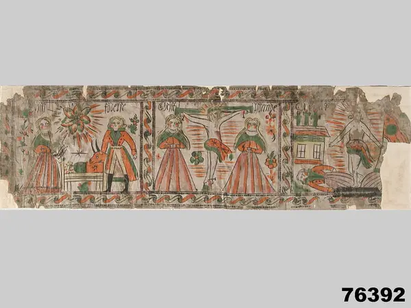 Huvudliggaren: " 'Tapet' fr. Förlanda sn. L. 1,76. B. 0,52. Väggmålning framställande: 'Christi födelse', Christi lidande' 'Christi Up'(ståndelse). Mycket sönder." Bilaga: Inget utöver huvudliggaren.
