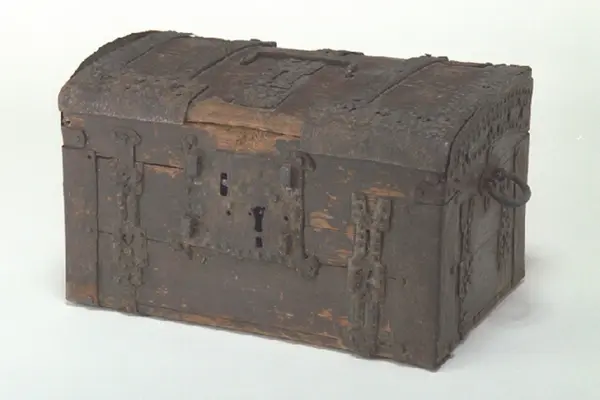 B 39, Djup 25, H 23,5 cm Skrin, rektangulärt, med fällock, av barrträ. Utanpåliggande botten fästad underifrån med spikar av järn. Järnbeslag runt hörnen samt på sidorna, fästade runt bottenkanten, upptill på gavlarna sitter rundade beslag som skjuter upp ovanför kanterna. Lockets kanter järnbeslagna, tre bandgångjärn fästade utvändigt tvärs över locket samt runt bottenkanten. Låset trasigt, nyckel saknas, antagligen med en låshasp som har fallit bort nu, järnplåt fästad på insidan över låset (hänger löst i en spik). Bygelhandtag av järn på locket samt på vardera gaveln. En del av beslagen har utstansade dekorer i form av hjärtan och kors. Utvändigt målat i brunt, färgen bortnött på flera ställen, även lockets insida har rester av brun färg. Botten och lock spräckta, sprickor finns även i sidorna.