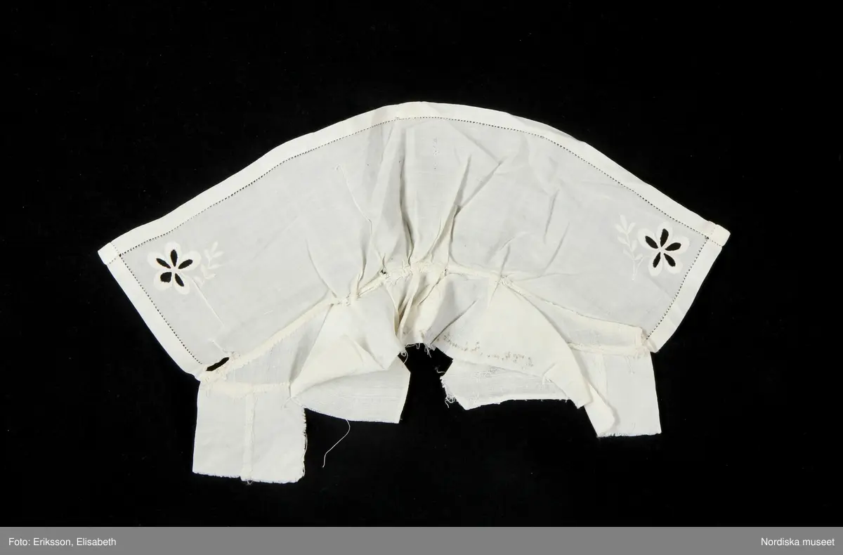 Krage i fint tuskaftat vitt bomullstyg. Två bröststycken fram sammansytt med ett bakstycke. Rund halsringning med fastsydd krage, 11 cm hög. Invikt fåll, 1 cm, enkel utdragssöm i fållkant. Intagning i halsringning mitt bak. Broderad blomma med stjälk och blad fram, plattsöm, vitt bomullsgarn. Blomman har hål i mitten. Två sydda knapphål. Öppen fram. Kragen är handsydd.